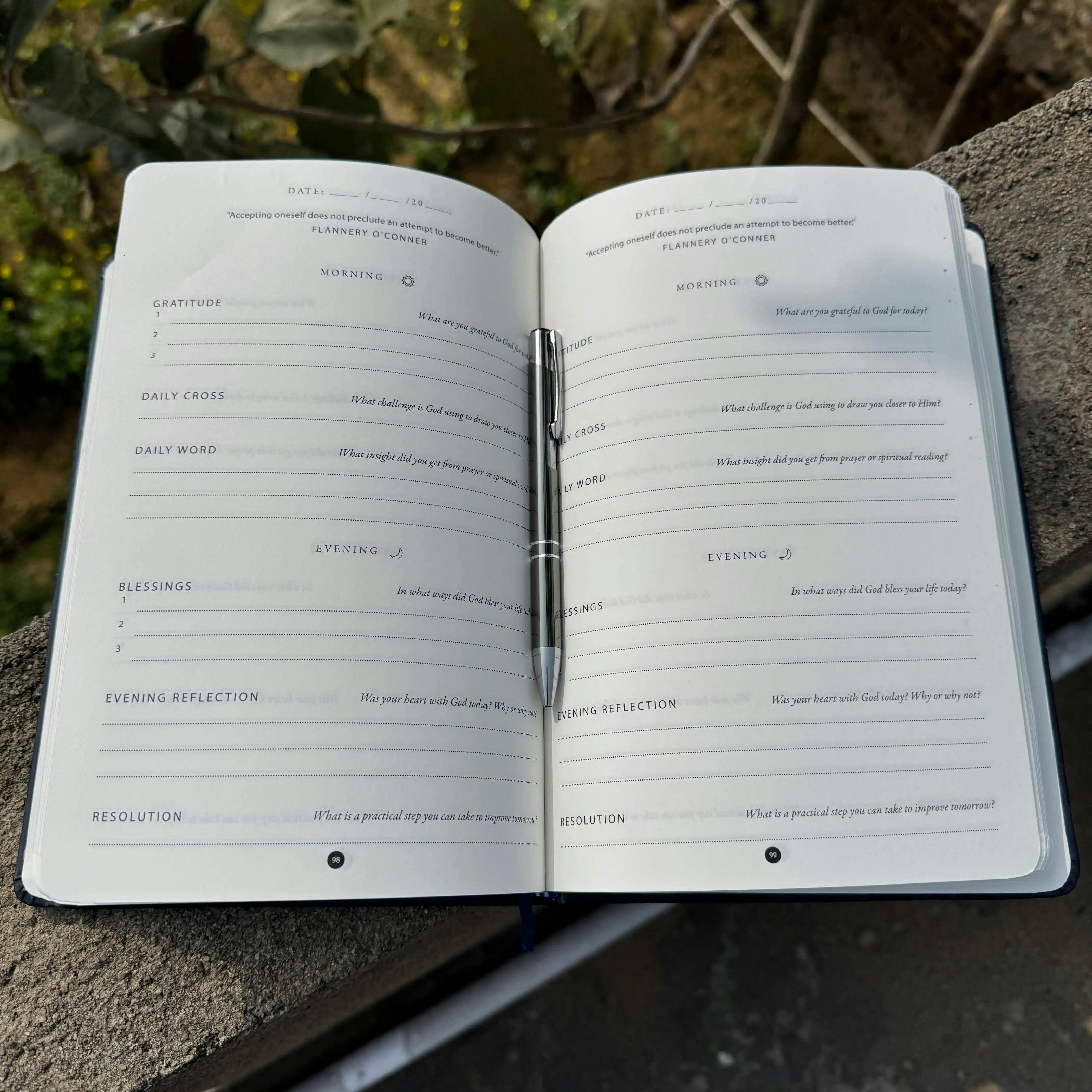 Each day follows a clear structure that gently guides you through morning intention and evening reflection, helping you stay rooted in faith without feeling overwhelmed. The journal removes the pressure of blank pages by offering a steady framework you can return to every day — making spiritual practice feel natural, not demanding.