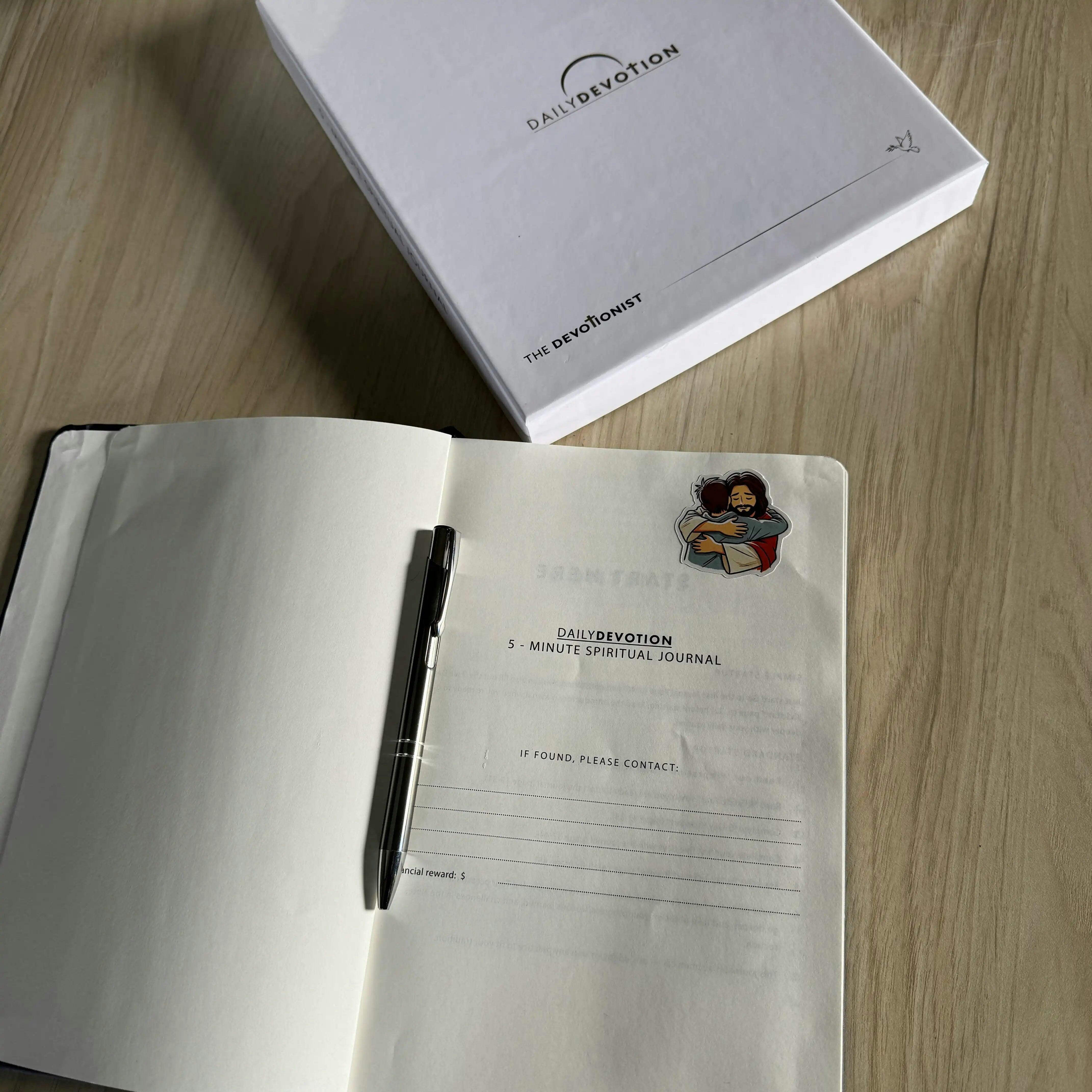 A premium 90-day devotion journal, a writing pen, and carefully designed packaging that supports a quiet, daily devotional ritual.